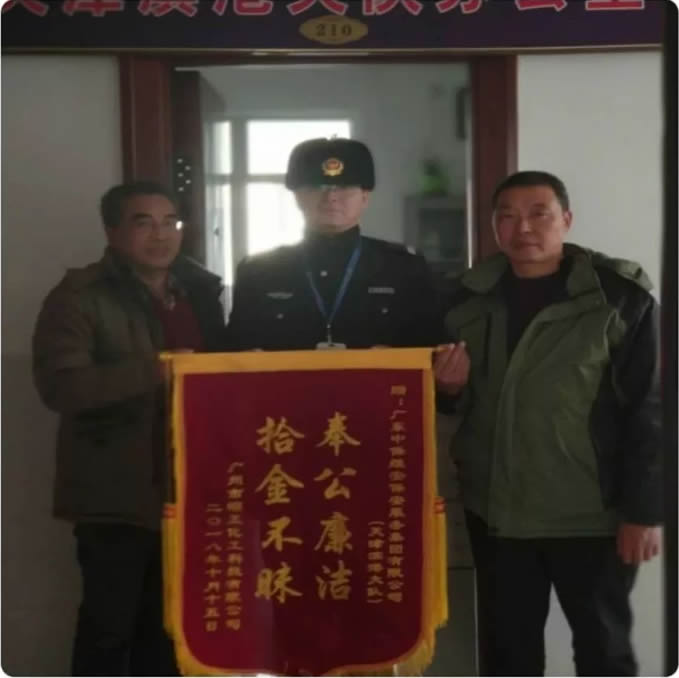 2018年12月15日上午,廣州市昭正化工科技有限公司(失主企業)的二位經理親自來到濱港大隊辦公室,送來“拾金不昧、奉公廉潔”的錦旗,并帶來現金紅包若干元,被我們婉拒。據查,該枚金戒指按市值價上萬元。同時天津濱港公司為楊毛祥同志拾金不昧的行為做出高度表揚,并倡導保安大隊繼續學習并發揚拾金不昧、奉公廉潔的精神。